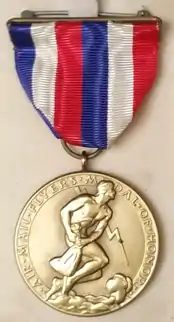The Airmail Flyers' Medal of Honor is a United States decoration issued by the Post Office Department. The decoration was authorized by Act of the United States Congress, February 14, 1931, for presentation by the President of the United States, but not in the name of the Congress. The medal was intended to recognize any person who, while serving as a pilot in the airmail service, distinguished themselves by acts of heroism or extraordinary achievement. Retroactive to May 15, 1918, when the firsts continuously schedule public service airmail route was established between Washington, D.C., and New York City by way of Philadelphia. Recommendations for the individual awards would come from the Postmaster General and be sent to the President for his approval and presentation.[1][2][3]