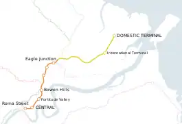 Airtrain (also known as the Airport railway line) is the privately owned commuter railway line that extends 13.0 km (8.1 mi) northeast from Brisbane (15.9 km (9.9 mi) from Central station by rail), the state capital of Queensland, to Brisbane Airport (BNE) at both its separate International and Domestic terminals. It was opened in 2001.