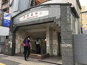 Akasaka Station (赤坂駅, Akasaka-eki) is a railway station in Chūō-ku, Fukuoka in Japan. Its station symbol is a track and field athlete in red be looks like "ア" which is Akasaka's initials, in connection with the annual Fukuoka Marathon, which starts and finishes at Heiwadai Athletic Stadium, located 600 m from this station.