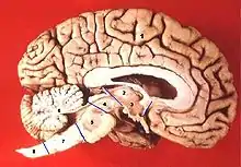 Another cause of both akinesia and mutism is ablation of the cingulate gyrus. Destruction of the cingulate gyrus has been used in the treatment of psychosis. Such lesions result in akinesia, mutism, apathy, and indifference to painful stimuli.[7] The anterior cingulate cortex is thought to supply a "global energizing factor" that stimulates decision making.[8] When the anterior cingulate cortex is damaged, it can result in akinetic mutism.