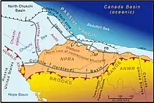 The Alaskan North Slope (ANS) is a foreland basin located on the northern edge of the Brooks Range. The Alaska North Slope is bounded on the north by the Beaufort Sea and runs from the Canadian border to the maritime boundary with Russia in the west. The western edge extends into the Chukchi Sea and Chukchi platform where the basin is at its widest. As the basin moves east it narrows towards the Canadian border. The basin is 1000 km long, 600 km at its widest, and covers a total area of 240,000 km2.[1]