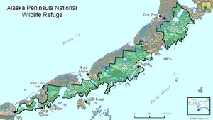 The Alaska Peninsula National Wildlife Refuge is a United States National Wildlife Refuge in southwestern Alaska whose use is regulated as an ecological-protection measure. It stretches along the southern coast of the Alaska Peninsula, between the Becharof National Wildlife Refuge on its east and the end of the peninsula at False Pass in the west. In between, however, it is broken into sections by lands of the Aniakchak National Monument and Izembek National Wildlife Refuge. The refuge is administered from offices in King Salmon, Alaska and was established to conserve Alaska Peninsula brown bears, caribou, moose, marine mammals, shorebirds, other migratory birds and fish, and to comply with treaty obligations.[2]