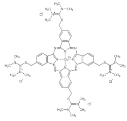 The phthalocyanine aromatic nucleus has a large conjugated system with a CBN (Conjugated bond number) of 48.[18] However it is the charges on the isothiouronium side groups that still keeps it water-soluble. These side groups can carry bulkier alkyl or aryl substituents rather than the 8x2 methyl groups as in the image given. These groups split off from the macrocyclic ring during the washing at the end of staining or by rather mild conditions (e.g. pH above 5.6) or during spontaneous degradation.