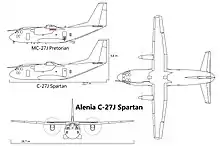 The Alenia C-27J Spartan[2] is a military transport aircraft developed and manufactured by Leonardo's Aircraft Division (formerly Alenia Aermacchi until 2016).[3] It is an advanced derivative of the former Alenia Aeronautica's earlier G.222 (C-27A Spartan in U.S. service), equipped with the engines and various other systems also used on the larger Lockheed Martin C-130J Super Hercules. In addition to the standard transport configuration, specialized variants of the C-27J have been developed for maritime patrol, search and rescue, C3 ISR (command, control, communications, intelligence, surveillance and reconnaissance), fire support/ground-attack and electronic warfare missions.