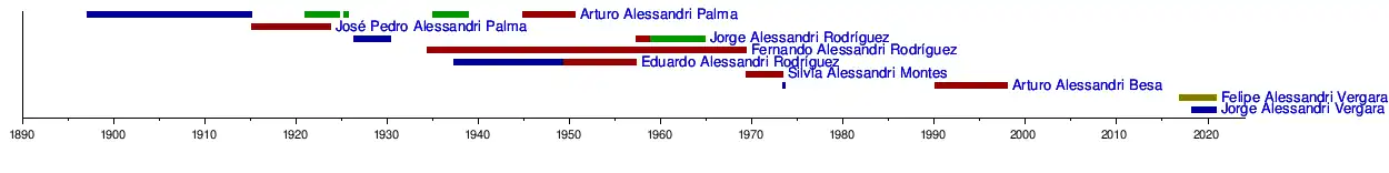 The Alessandri family of Chile is of Italian origin, became politically influential during the early part of the 20th century, and has played (and still plays) a significant role in Chilean politics. The first Alessandri who came to Chile was Giuseppe Pietro Alessandri Tarzi, who arrived in the early 1800s as consul posterior, representative of the Kingdom of Sardinia.[1]