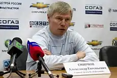 Smirnov is currently the head coach of the Severstal Cherepovets of the Kontinental Hockey League in Russia.[1] He has been the head coach of the Storhamar Dragons on two occasions,[2] and has previously coached Gjøvik Hockey, Norway.