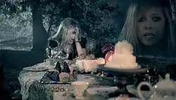 She arrives at a tea party, and the Mad Hatter (Johnny Depp) stands, welcoming her with open arms. The scene is edited with footage of the Mad Hatter from Burton's film. As Lavigne sinks into a chair singing, her lyrical "echo" is visually emphasized with her face quickly dissolving in and out. As the verse ends, Lavigne stands and runs away from the scene. The chorus of the song returns to shots of Lavigne running through the forest, arriving at a piano surrounded by giant mushrooms. The video cuts between shots of Lavigne playing the instrument and singing, eventually showing Lavigne running through a misty copse of bamboo trees. Various scenes from the film are shown in succession, before Lavigne is reintroduced running toward an opening in the forest. As she exits the forest, she is dressed in her normal clothing.[27]