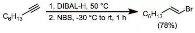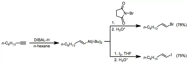 Treatment of alkenylaluminates with halogen electrophiles such as N-bromosuccinimide (NBS) and iodine leads to the formation of halogenated olefins.[16] These products are useful for cross-coupling reactions.