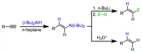 Reactions of alkenyl- and alkynylaluminium compounds involve the transfer of a nucleophilic alkenyl or alkynyl group attached to aluminium to an electrophilic atom. Stereospecific hydroalumination, carboalumination, and terminal alkyne metalation are useful methods for generation of the necessary alkenyl- and alkynylalanes.[1]