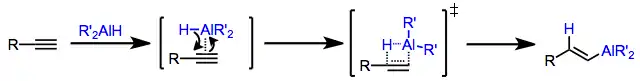 Hydroalumination of alkynes may be either stereospecifically cis or trans depending on the conditions employed. When a dialkylalane such as di(isobutyl)aluminium hydride (DIBAL-H) is used, the hydrogen and aluminium delivered from the reagent end up cis in the resulting alkenylalane.[7] This stereospecificity can be explained by invoking a concerted addition of the H–Al bond across the triple bond. In the transition state, partial positive charge builds up on the carbon forming a bond to hydrogen; thus, the carbon better able to stabilize a positive charge becomes attached to hydrogen in the product alkenylalane.[8] Hydroaluminations of terminal alkynes typically produce terminal alkenylalanes as a result. Selectivity in hydroaluminations of internal alkynes is typically low, unless an electronic bias exists in the substrate (such as a phenyl ring in conjugation with the alkyne).[9]