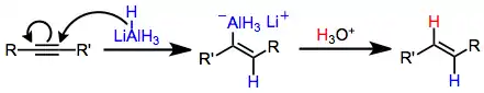 Stereospecific trans hydroalumination is possible through the use of lithium aluminium hydride. The mechanism of this transformation involves the addition of hydride to the carbon less able to stabilize the developing negative charge (viz., in the β position to an electron-withdrawing group).[10] Coordination of aluminium to the resulting trans vinyl carbanion leads to the observed trans configuration of the product.[11]