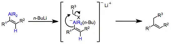 Alkenyl- and alkynylaluminates are most commonly generated through the addition of n-butyllithium to the alkenylalane. The alkenyl and alkynyl groups, which are better able to stabilize negative charge, are transferred in preference to the alkyl group. When these intermediates react with alkyl halides, functionalized olefins are produced.[15]