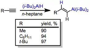 Stereospecific cis-hydroalumination is possible through the use of dialkylalanes. The most common reagent used for this purpose is di(isobutyl)aluminium hydride (DIBAL-H). Analogous to hydroboration reactions with R2BH, hydroalumination with R2AlH leads to the attachment of aluminium at the carbon less able to stabilize developing positive charge (anti-Markovnikov selectivity).[12] Metalation of terminal alkynes is a significant side reaction that occurs under these conditions. If metalation is desired, tertiary amine complexes of DIBAL-H are useful.[13]