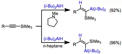 The use of silyl acetylenes avoids the problem of competitive metalation of terminal alkenes. The stereoselectivity of hydroalumination can be altered through a change in solvent: tertiary amine solvents provide the cis alkenylalane and hydrocarbon solvents provide the trans isomer.[14]