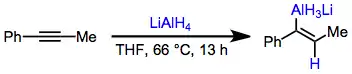 Lithium aluminium hydride hydroaluminates alkynes to afford trans alkenylalanes. In equation (7) hydride adds to the terminal carbon, which places the developing negative charge next to the stabilizing phenyl substituent.[10]
