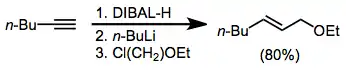 This concept has been applied to methods for the synthesis of organic compounds from alkenyl- and alkynylalanes. The most notable applications are methods for the stereospecific synthesis of olefins. Alkenylalanes, which are easily synthesized with complete stereocontrol through alkyne hydroalumination, transfer the alkenyl unit to a variety of electrophiles. Alkynylalanes are less commonly used because alkali metal acetylides can be used for many of the same transformations as alkynylalanes. However, alkynylalanes are useful for the coupling of tertiary halides and alkynes (a reaction difficult to effect with alkali metal alkynes)[4] and for conjugate addition[5] and epoxide opening reactions.[6]
