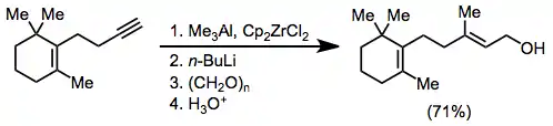 Zirconium-catalyzed carboalumination of alkynes by trimethylalane is a convenient method for accessing substituted alkenylalanes stereoselectively.[17] Upon exposure to aldehydes and ketones, alkenylalanes form secondary or tertiary allylic alcohols. Formaldehyde is a useful reagent in this context for the introduction of a hydroxymethyl unit.[18]