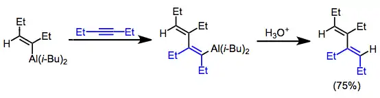 When alkynes and dialkylalanes are combined in a 2:1 ratio, 1,3-dienes result. The aluminium-carbon bond of the initially formed alkenylalane adds across a second molecule of alkyne, forming a conjugated dienylalane. Protonolysis provides the metal-free diene product.[20]