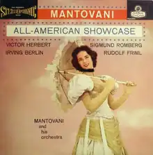 All-American Showcase is a double album of music by four American composers performed by the Anglo-Italian conductor Mantovani and His Orchestra. It was released in 1959 by London Recordings (catalog nos. PSA 3202 and LL 3122/3). Each of the four sides is dedicated to one of four composers: Sigmund Romberg, Victor Herbert, Irving Berlin, and Rudolf Friml.[1][2] It debuted on Billboard magazine's pop album chart on January 4, 1960, peaked at the No. 8 spot, and remained on the chart for 18 weeks.[3] AllMusic later gave it a rating of three stars.[2]