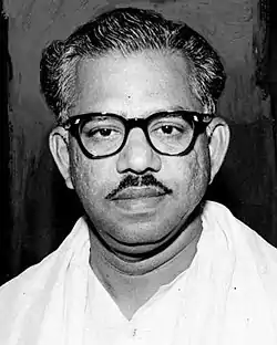 The party was founded on 17 October 1972, as Anna Dravida Munnetra Kazhagam (ADMK) by M. G. Ramachandran (M.G.R.), a veteran Tamil film star and popular politician. It was set up as a breakaway faction from the Dravida Munnetra Kazhagam after its president M. Karunanidhi expelled him from the party for demanding an account as the party treasurer.[49] M.G.R., who wanted to start a new political party, then incorporated into Anakaputhur Ramalingam's party, which had registered under the name ADMK. He then quoted, "I joined the party started by an ordinary volunteer" and gave the post of Member of Legislative Council (MLC) to Ramalingam. Later, M.G.R. prefixed the All India (AI) tag to the party's name to protect the party during the Maintenance of Internal Security Act (MISA).[50] Since its inception, the relationship between the AIADMK and DMK has been marked by mutual contempt. M.G.R. used his fan club to build the party cadre; he claims his party recruited more than a million members in the first two months. C. N. Annadurai's ideologue and movie producer turned politician R. M. Veerappan was the key architect in unifying M.G.R. fan clubs and further consolidating the party structure in the 1970s. Other key leaders, such as Nanjil K. Manoharan and S. D. Somasundaram played major roles in consolidation.[51] Pavalar M. Muthusamy was elected the first presidium chairman of the party.[52] The party's first victories were the wins of Maya Thevar in the Dindigul parliamentary bye-election in May 1973[53] and of C. Aranganayagam in the Coimbatore West assembly bye-election a year later. On 2 April 1973, the AIADMK emerged as the third-largest political party in Tamil Nadu, represented by 11 MLAs in the assembly. By January 1976, the AIADMK had emerged as the second-largest political party in Tamil Nadu, with 16 MLAs in the assembly. By supporting the National Emergency between 1975 and 1977, the AIADMK grew close to the Indian National Congress party.