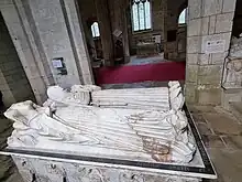 The set of alabaster monuments are described as being "the glory of the church";[1] they consist of the effigies of six recumbent couples lying on tomb chests, and all depict members of families connected with the Harewood estate.[1] All the monuments were originally brightly coloured, but the colour has been lost, leaving the white alabaster. A major programme of conservation was carried out in 1978 when they were dismantled and reerected as close as possible to their original locations.[10] On the sides of the tombs are depictions of angels, saints and mourners.[7] The oldest tomb, in the south chapel, is that of Sir William Gascoigne, Lord Chief Justice and his wife Elizabeth; it dates from about 1419.[1] Sir William is dressed in his robes and he carries a purse and a dagger. The later tombs display a greater sophistication in their carving, and they reflect the fashions of the day.[2] The latest effigies are of Edward Redman (Redmayn)[11] and his wife Elizabeth Huddleston, dating from about 1510; the depiction of Edward Redman is said to be a true-to-life portrait, a rarity at the time it was carved.[12]