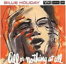 All or Nothing at All is a studio album by Billie Holiday, released in 1958 on Verve Records, catalog MGV8329.[4] There are 12 songs on the LP taken from five different recording sessions that took place in 1956 and 1957.[5] Holiday was backed by a "relaxed and understanding"[6] small combo which included the trumpeter Harry "Sweets" Edison and the saxophonist Ben Webster. A 1959 New York Times article noted that Holiday's voice "had become a very limited instrument which she used with the craft and guile of an aging pitcher who can no longer pour his fast one across the plate."[7]