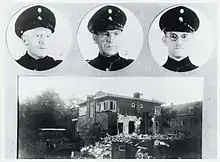 The police station in Amsterdam-Noord that was bombed during the 17 July 1943 raid. On top are three portraits of officers that did not survive the attack: Dirk Tigchelaar, Roelof Luns, and Gerrit Egbert Sempel.