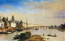 For centuries, the Alte Brücke was considered to be the most significant and beautiful building of Frankfurt. The panorama of city and bridge has inspired many painters for this reason, for example Conrad Faber, Matthäus Merian, Anton Kirchner, Anton Radl, Domenico Quaglio, Carl Morgenstern, Friedrich Wilhelm Delkeskamp, Carl Theodor Reiffenstein and Gustave Courbet. A major representative of the Kronberg artist colony, Fritz Wucherer, and the painter Otto Meisner created the last depictions of the Alte Brücke before it was deconstructed.