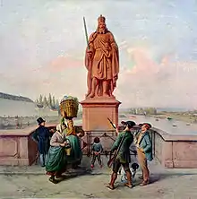 On 23 August 1843, the thousandth commemoration day of the Verdun Treaty, the Städel Museum (city museum) donated a statue of Charlemagne to the city. The sculpture, made of red sandstone by sculptor Johann Nepomuk Zwerger, was deployed at the eastern middle pillar of the bridge, facing the city. In the progress of deconstructing the Alte Brücke in 1914, this statue was moved to the yard of the Historical Museum of Frankfurt. During the bombing of Frankfurt in World War II, the statue has been severely damaged; the head and the hands of the statue have been destroyed. In 1986, it was repositioned in front of the entrance of the historical museum in Römerberg, after sculptor Edwin Hüller had restored head and hands of the statue. In 2011, the museum in Römerberg was deconstructed to be re-built, and the sculpture was moved to a depot. During discussions in Frankfurt to extend and renovate the Alte Brücke, the citizens expressed the wish to re-situate the Charlemagne statue in its original place on the bridge. Because the financial situation of the city did not allow such a project at that time, a society named Brückenbauverein Frankfurt e.V. ("bridge building club of Frankfurt, registered society") was founded in 2006, under the lead of architect Christoph Mäckler.[20] In the end of 2014, the city community council decided to leave the original in the new museum building in Römerberg, and to put up a copy on the Alte Brücke, exactly where the "Brickegickel" had been located from 1967 to 2013. On 1 October 2016, mayor Feldmann inaugurated the memorial.[21]