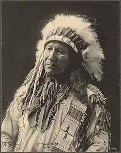 There are two Oglala Lakota chiefs named American Horse notable in American history. Historian George E. Hyde distinguished them by referring to "Chief American Horse the Elder" as the son of Old Chief Smoke and the cousin of Red Cloud, and "Chief American Horse the Younger" as the son of Sitting Bear, and son-in-law to Red Cloud.[51] American Horse the Younger (1840 – December 16, 1908) was an Oglala Lakota chief, statesman, educator and historian. American Horse the Younger is notable in American history as a U.S. Army Indian Scout and a progressive Oglala Lakota leader who promoted friendly associations with whites and education for his people. American Horse the Younger opposed Crazy Horse during the Great Sioux War of 1876-1877 and the Ghost Dance Movement of 1890, and was a Lakota delegate to Washington. American Horse the Younger was one of the first Wild Westers with Buffalo Bill's Wild West and a supporter of the Carlisle Indian Industrial School. "His record as a councillor of his people and his policy in the new situation that confronted them was manly and consistent and he was known for his eloquence." American Horse the Younger gained influence during the turbulence of the Great Sioux War of 1876-1877. After news of the death of Chief American Horse the Elder at the Battle of Slim Buttes, Manishnee (Can not walk, or Played out)" seized an opportunity and assumed the name "American Horse." [52] American Horse the Younger was not related to American Horse the Elder, son of Old Chief Smoke. He was the son of Sitting Bear, leader of the True Oglalas, a band of Oglala opposed to the Smoke people [53] The identities and accounts of American Horse the Elder and the American Horse the Younger have been blended by some historians. Like his great friend Crazy Horse, there are no known photographs or drawings of Chief American Horse the Elder.[54] "The Oglalas seem incapable of clearing up the tangle."[55]