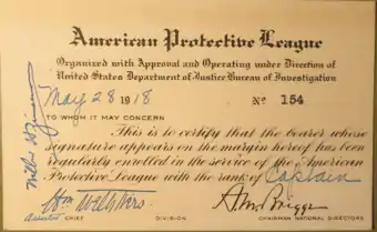 Under this directive, the APL worked with the Bureau of Investigation (BOI)—precursor to the FBI—which gathered information for U.S. District Attorneys.[4] APL assistance was welcomed by the BOI, which in 1915 had only 219 field agents, without direct statutory authorization to carry weapons or to make general arrests.[4] Thus the author of a letter to the New York Times claimed membership in the APL and described it as "a volunteer unpaid auxiliary of the Department of Justice" in which he and his colleagues "have been acting upon cases assigned by the Department of Justice, Military Intelligence, State Department, Civil Service, Provost Marshal General, etc."[5]
