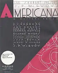 Americana is a musical revue in two parts, with book and lyrics by J. P. McEvoy, and music by Con Conrad with additional numbers by George Gershwin, Ira Gershwin, Philip Charig, James Hanley, B. G. DeSylva, Morrie Ryskind, Arthur Schwartz, Theo Goodwin, Joe Young, and Sam Lewis. The show was presented by Richard Herndon at the Belmont Theatre (121 W. 48th Street, New York, NY), and, after many postponements, opened July 26, 1926.[1] The show was staged by Allan Dinehart with dance numbers by Larry Ceballos. The production was designed by John Held, Jr. It ran for 224 performances, closing in February 1927.[2] The cast headlined Lew Brice, Roy Atwell, Betty Compton, Charles Butterworth and the Eddie Elkins Orchestra.[2] The New York Times review called it a "witty, ingenious and sophisticated evening of fun-making, it made up in its abundant humor for more than it lacked in some other departments." The other departments referred to were lack of chorus girls and opulent settings.[3]