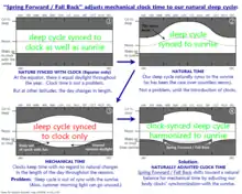 Experts in circadian rhythms and sleep have warned about the negative health implications of DST. DST reduces sleep time and causes an increased mismatch between the body clock and local time, a condition called social jetlag. Both sleep deprivation and social jetlag have been associated with negative effects on physical and mental health outcomes, including increased risks for diabetes, obesity, heart disease, depression, and some forms of cancer.[1][2][62] Year-round standard time has been proposed as the preferred option for public health and safety.[63][64][65][66][67]