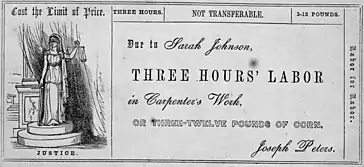 Josiah Warren termed the phrase "Cost the limit of price", with "cost" here referring not to monetary price paid but the labor one exerted to produce an item.[24] This understanding of cost is congruent with that of the classical economist Adam Smith who said: "The real price of every thing, what every thing really costs to the man who wants to acquire it, is the toil and trouble of acquiring it". However, Warren reached different conclusions as he believed that goods and services should trade according to how much labor was exerted to produce them and bring them to market, instead of according to how individuals believed them to be subjectively worth. Therefore, "[h]e proposed a system to pay people with certificates indicating how many hours of work they did. They could exchange the notes at local time stores for goods that took the same amount of time to produce".[22] To charge more labor for something that entailed less labor was "cannibalism", according to him.[148] Moreover, he believed that trading according to "cost the limit of price" would promote increasing efficiency in an economy, as he explains in Equitable Commerce: