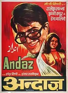 Andaz (transl. Style) is a 1971 Indian Bollywood romantic drama film, directed by Ramesh Sippy in his directorial debut, and written by Salim–Javed, Gulzar and Sachin Bhowmick.[1] It stars Shammi Kapoor, Hema Malini, Rajesh Khanna, and Simi Garewal.