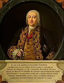 He was born and died in Madrid, the grandson and son of the 1st and 2nd Directors of the Royal Spanish Academy, respectively. Himself became a member at the age of 16, on 25 April 1726. He married Ana María de Toledo Portugal y Córdoba, 11th Countess of Oropesa in 1727, who gave him two daughters and died in 1729. He married for a second time with Isabel María Pacheco Téllez-Girón y Toledo in 1731. Fernández Pacheco became the 3rd lifetime Director of the Royal Spanish Academy at the death of his father in 1738 (aged 28).[1] He was promoted to be a Knight of the Order of the Golden Fleece. He died at the age of 36 in 1746.