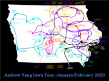 According to The Des Moines Register Candidate Tracker, Yang appeared at 78 events in Iowa in January and 14 events in Iowa in February.[49] The Iowa caucus ended without the declaration of a winner due to questions surrounding discrepancies over vote counts.[50] Yang received 8,914 votes in the first alignment in Iowa, which was 5.1% of all votes cast. In the second alignment, Yang received 1,758 votes, which was 1.0% of all votes cast. Yang received 22 state delegate equivalents, which was 1.0% of all state delegate equivalents available. He did not win any delegates to the national convention.[51] Yang's campaign fired 130 staffers in the aftermath of the Iowa caucus. Zach Graumann, Yang's campaign manager, said that the layoffs were part of a "natural evolution" of the campaign after Iowa. A spokesperson for the campaign stated that the layoffs were unrelated to negotiations between the campaign and its unionized workers.[52]