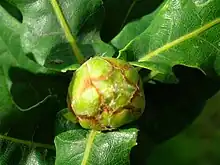 Andricus foecundatrix (formerly Andricus fecundator) is a parthenogenetic gall wasp which lays a single egg within a leaf bud, using its ovipositor, to produce a gall known as an oak artichoke gall, oak hop gall, larch-cone gall or hop strobile[1][2] The gall develops as a chemically induced distortion of leaf axillary or terminal buds on pedunculate oak (Quercus robur) or sessile oak (Quercus petraea) trees. The larva lives inside a smaller hard casing inside the artichoke and this is released in autumn. The asexual wasp emerges in spring and lays her eggs in the oak catkins. These develop into small oval galls which produce the sexual generation of wasps.[3][4] A yew artichoke gall caused by the fly Taxomyia taxi also exists, but is unrelated to the oak-borne species. Previous names or synonyms for the species A. fecundator are A. fecundatrix, A. pilosus, A. foecundatrix (see below), A. gemmarum, A. gemmae, A. gemmaequercus, A. gemmaecinaraeformis and A. quercusgemmae.