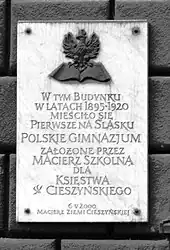 On 3 June 1896 Grodyński married Alicja Matter,[9] the daughter of Alfons, a renowned builder, businessman and councillor in Cieszyn who was also a member of the Association of Silesian Catholics (pl)[10] and who also supported the opening of what was the first recognized "Polish School" in Cieszyn.[11] In 1897 Grodyński was appointed as a judge in Jabłonków where he moved with Alicja before relocating again in 1903 to take up the position of head of court in Strumień (where Oskar Zawisza became the local priest). In 1907 he transferred[12] to the District Court in Cieszyn, in which city he continued to reside (at 34 Bielitzerstrasse now Bielska street) even after his later appointment as President of the Court of Appeal in Katowice.