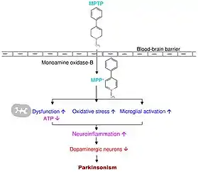 - ↑ Rodriguez-Pallares, J.; Parga, J. A.; Muñoz, A.; Rey, P.; Guerra, M. J.; Labandeira-Garcia, J. L. (2007-06-15). "Mechanism of 6-hydroxydopamine neurotoxicity: the role of NADPH oxidase and microglial activation in 6-hydroxydopamine-induced degeneration of dopaminergic neurons". Journal of Neurochemistry. 103 (1): 070615193023005––. doi:10.1111/j.1471-4159.2007.04699.x. ISSN 0022-3042. PMID 17573824. S2CID 20714033.