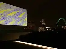 Beginning in 2014, Glesta has been travelling a large-scale video installation entitled WATERSHED to prominent locations in New York and London in an effort to facilitate discussion on climate change and infrastructure improvements in waterfront cities. The video originated from a commission by ARTPORT making waves for their exhibition (Re-) Cycles of Paradise which was commissioned by several UN related organisations and governments for the COP15 UN Climate Conference in Copenhagen in 2009 and which traveled later to Mexico City, Cuernavaca, and Lace Gallery Los Angeles, Ca .[9] There, Glesta learned about the impact of sea level rise on the planet. Sponsored by a fellowship from the LABA Foundation in NYC, Glesta developed THE WATERSHED Project, an installation that later was exhibited throughout the world. The installation itself features footage of fish swimming underwater that is projected onto surfaces in areas that will be affected by impending sea level rise. In 2015, WATERSHED appeared on the National Theatre in London; in 2016, it was commissioned by Al Gore for an event at the New York Custom House on Ellis Island; in 2017, it was projected on the sidewalk outside the Red Hook branch of the New York Public Library.;[10] most recently in 2020, it was projected on the Parrish Art Museum and at the Basilica in Hudson, New York.