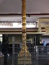 When Anna Nagar was developed as a model town in the late 1960s, the annual vilakku pooja during the mandala makaravilakku season was celebrated by Ayyappa devotees in the newly formed Shanti Colony. The residents' response to this annual celebration resulted in the formation of the Sri Ayyappa Seva Samajam (SASS) in 1976, with 14 members in its committee. In 1979, the Samajam started a charitable medical centre for the poor and needy.[1] The same year, a 7-ground land near the Visveswarayya Tower was allotted to the Samajam by the Tamil Nadu Housing Board for the construction of a temple, for which members contributed ₹ 38,000 towards initial payment.[1] Initially, a makeshift temple was built in a thatched shed along with a charitable medical centre in another shed.[2] Work on the construction of a permanent temple continued for the next five years in consultation with temple architect Kanipayyur Krishnan Namboodiri. The construction was guided by P. N. Subramaniam, the founder-president, P. Chandrasekhara Menon, the second president, and P. V. Nair, and financial support was provided by R. Ratnam, then chairman of Sundaram Industries, and P. Velayudham.[1] In May 1984, the typical Kerala-style temple was completed, conforming to the traditional shastraic stipulations. The kumbabishekam and consecration of the idol were performed on 13 May 1984 by temple Thantri Abli Krishna Vadhyan Namboodiri and K. M. Kesva Battatripad, former chief priest of the Sabarimala Temple.[2] The panchaloha Ayyappan idol was made by Chenganur T. Rajarathinam.[1] Idols of Ganesha, Subramanya, Goddess Durga, and Anjenaya were also consecrated. Later, a Navagraha (the nine planets) shrine was added in the temple. In 1989, a unique architectural structure known as the Natamandapam with an imposing gopuram was added. In 2005, gold covering of the 22-paras (segments) dwajasthambam and 27 thazhikakudams with about 6 kg of gold was completed. A special kumbabishekam of the gold-covered dwajasthambam was performed on 20 June 2005.[2]