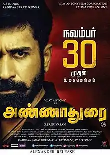 Annadurai is a 2017 Indian Tamil-language action drama film written and directed by G. Srinivasan. The film stars Vijay Antony in a dual role as identical twin brothers along with Diana Champika, Mahima, and Jewel Mary, while Radha Ravi and Kaali Venkat play supporting roles. Vijay Antony also composed music for the film and also served as the film editor for the first time in his career. Produced by Fatima Vijay Antony and Radhika, the film began production during February 2017 and was released on 30 November 2017.[1]