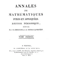 The Annales de Mathématiques Pures et Appliquées (from French: Annals of Pure and Applied Mathematics), commonly known as the Annales de Gergonne (Annals of Gergonne), was a mathematical journal published in Nimes, France from 1810 to 1831 by Joseph Diez Gergonne. The annals were largely devoted to geometry, with additional articles on history, philosophy, and mathematics education showing interdisciplinarity.[1][2]