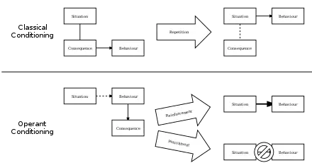 On the other hand, operant conditioning is when we respond for stimuli, not to it.[3] It is another form of social learning in which the consequence of a response makes us respond more, or more often.[3]