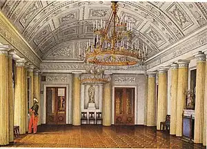 The Arabian Hall, sometimes known as the Blackamoor Hall or the Arabian Dining Room, is one of the private rooms of the Winter Palace in Saint Petersburg. In the Tsarist era, it was the room from which imperial processions through the state rooms began. The double doors[1] were designed to be on a straight axis through the principal state rooms and ultimately the Jordan Staircase, forming an enfilade. Thus it was here the Romanov family often assembled, in private, before state receptions and occasions.[2] The privacy of the room was not compromised by the small private courtyard (see plan) from which windows, which once led to the Tsaritsa's winter-garden below, admitted light.