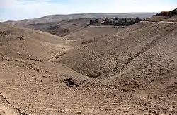 Arad's elevation ranges between approximately 361.5 and 631.1 metres (1,186 and 2,071 ft) above sea level,[17] a notable peak being Mount Kidod (600 m or 2,000 ft), located at the northeastern point of the city and named after Ras al-Kadadeh, the Arabic name for the hill.[3][4] Other peaks within the municipal borders include Mount Kina (635 m or 2,083 ft) and Mount Brir (537 m or 1,762 ft). There are several wadis that pass through Arad, notably the Ye'elim Stream (which runs along Highway 31) and Tze'elim Stream. Others include the Hesed, Keisan, Kidod, Kina, Malhata, Pra'im, Tavya, and other streams.[20]