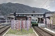 Arashiyama Station (嵐山駅, Arashiyama-eki) is a tram stop in Ukyo-ku, Kyoto, Japan,[3] and the western terminus of the Randen Arashiyama Line that begins at Shijō-Ōmiya. The station includes a small shopping arcade, outdoor eating areas, a foot bath, a garden featuring cherry and maple trees, as well as the "Kimono Forest," a collection of 600 kimono gowns wrapped around poles with LED lighting inside[4][5] developed by the interior designer Yasumichi Morita.