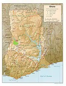During the height of the slave trade, the Banda District served as a source of slaves, as well as a place for the containment, holding and purchasing of war captives.[2] The Bono were known to send Banda war captives from their military campaigns in the north into the Atlantic trade as slaves.[5] During the 19th century, there was a considerable increase in slave demands to satisfy not only the Atlantic slave trade, but the internal slave trade as well.[5] Much of the internal slave demand was generated by their use as payments and laborers in harvesting crops and other resources such as gold. With the influence of the British, changes in economic structure can also be seen. Groups here moved from practices that were community based and resistant to risk, to practices that were more focused on the individual and favored the production of specialized commodities.[5][2]