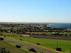 Although the surrounding grain farmers continued to prosper, there was little change in the size of the town during the early 1900s. After the depression in the 1930s, the town and its businesses were largely stagnant until a large open-cut dolomite mine was opened by BHP in the 1950s for use at its Whyalla Steelworks on the Eyre Peninsula and Port Kembla in New South Wales. A new 1-kilometre (3,300 ft) long jetty was added and at the same time construction was started with grain storage silos. The "new" jetty currently services ships loading dolomite, grain and salt from the solar salt pans at Price, located approximately 10 kilometres (6.2 mi).[8] The wharf is located 1.5 kilometres (0.93 mi) south of the town jetty, and can accommodate vessels of Handymax class.